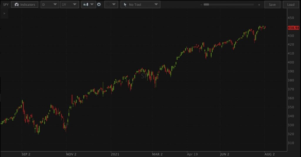 Here is a one-year chart of the SPY (S&P500) through today… Straight Up!